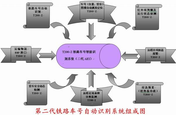 基于上述背景,我司在积累大量应用实践经验的基础上推出为厂矿企业量身定做的第二代可视化铁路车号自动识别系统——T200-Z型铁路车号智能识别系统(二代AEI),该系统与传统的铁道部一代AEI有质区别,二代AEI系统不仅具有一代AEI系统的铁路车号自动识别的基本功能,而且还结合了摄像抓拍技术、图像压缩定位技术、红外判辆技术及远程在线诊断技术,真正的实现了铁路运输信息的智能化识别管理。